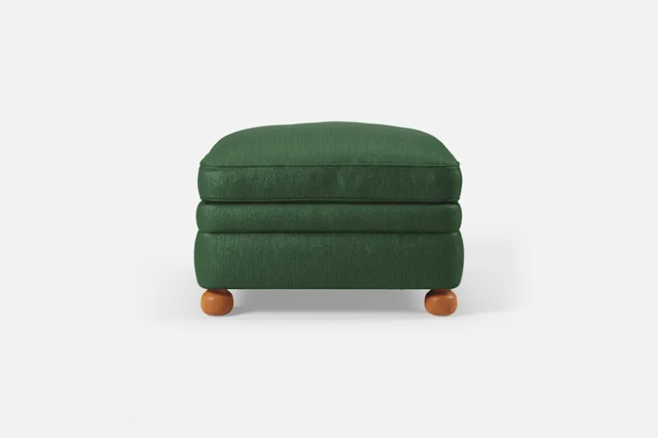 Trästomme. Flätade elastiska sadelgjordsband. Stoppad med kallskum/polyeteroch syntetvadd. Plymå av syntetfiber och fjäder. Ej avtagbart plymåfodral. Klotfötter av betsad bok. Klädd i tyget Vägen mörkgrön. Pallen är hantverksmässigt tillverkad i Sverige. Samtliga Svenskt Tenns nyproducerade möbler är försedda med en plakett som visar att möbeln är äkta.