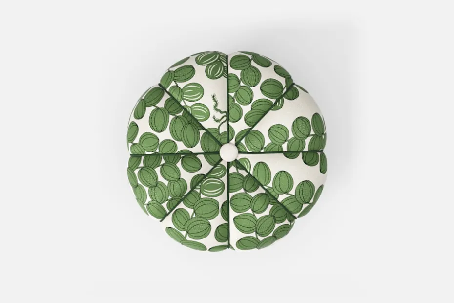 Den vackra, textilklädda pallen med mjuka, runda former ritades av Josef Frank för Svenskt Tenn cirka 1935. Pallen gjordes som en omarbetad variant av en möbel han skapade för sitt företag Haus und Garten i Wien, omkring 1929.