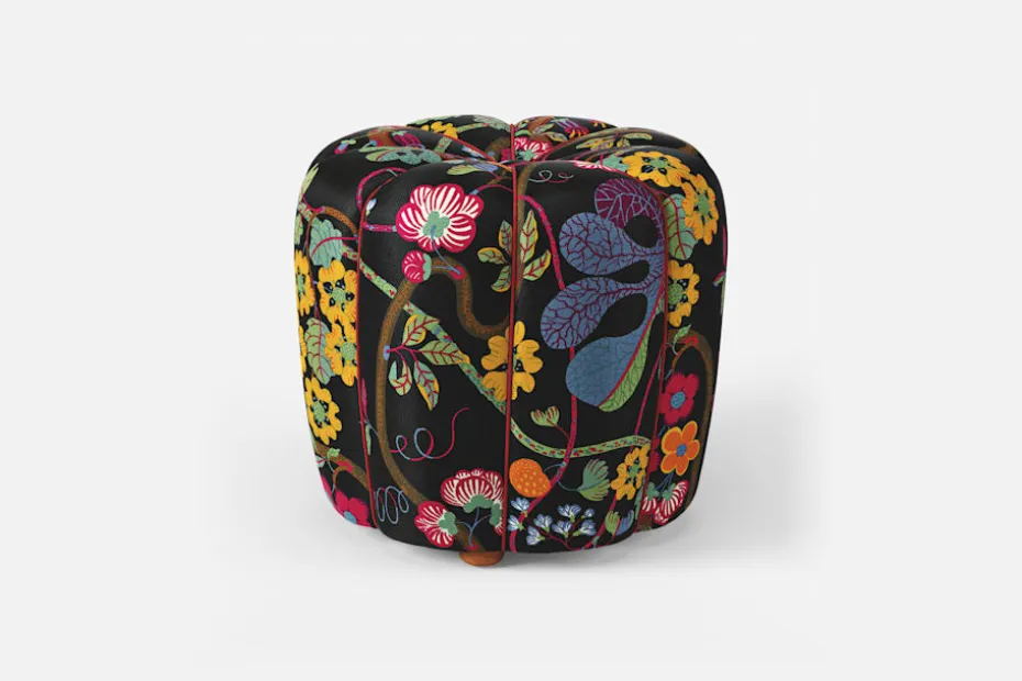 Den vackra, textilklädda pallen med mjuka, runda former ritades av Josef Frank för Svenskt Tenn cirka 1935. Pallen gjordes som en omarbetad variant av en möbel han skapade för sitt företag Haus und Garten i Wien, omkring 1929.