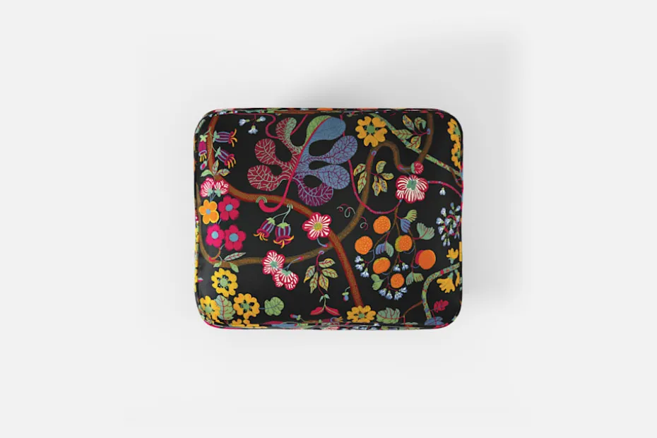 Denna fotpall formgavs av Josef Frank år 1936 tillsammans med fåtölj 568. Den generösa sittplymån under dynan och de facetterade nedåt avsmalnande benen är typiska för Josef Franks formspråk.