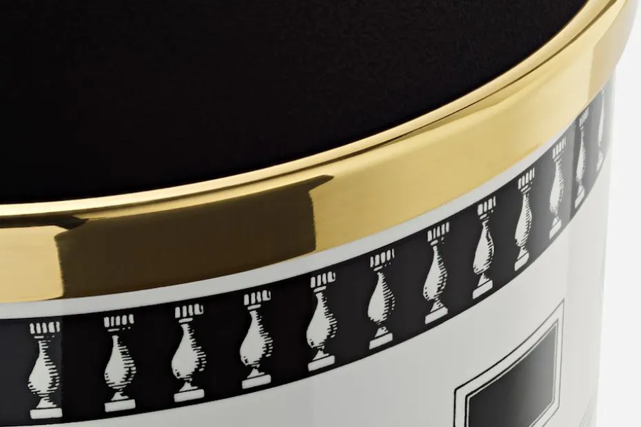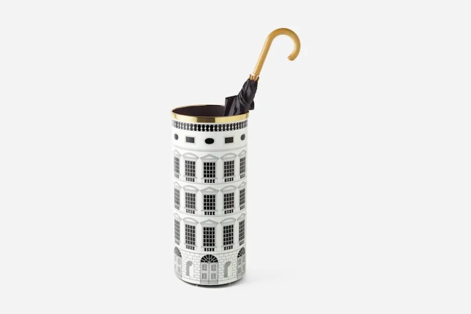 Ett dekorativt paraplyställ i lackerad plåt med Fornasettis karaktäristiska mönster Architettura; en vacker illustration av en arkitektonisk byggnad i svartvit design. Den utsökta formen och estetiken omvandlar en regnig dag till en konstnärlig upplevelse. Samtliga Fornasettis kreationer, från möbler till inredningsdetaljer, tillverkas för hand i Italien. I företagets ateljé arbetar skickliga hantverkare med samma tekniker som användes när de allra första produkterna togs fram. Färgen appliceras för hand med utgångspunkt i originalmönstren.