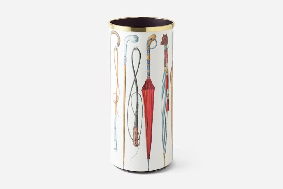 Ett dekorativt paraplyställ i lackerad plåt med Fornasettis karaktäristiska mönster Ombrelli e Bastoni; ett vackert motiv med paraplyer och käppar i olika färger. Den utsökta formen, färgerna och estetiken omvandlar med lätthet en regnig dag till en konstnärlig upplevelse. Samtliga Fornasettis kreationer, från möbler till inredningsdetaljer, tillverkas för hand i Italien. I företagets ateljé arbetar skickliga hantverkare med samma tekniker som användes när de allra första produkterna togs fram. Färgen appliceras för hand med utgångspunkt i originalmönstren.