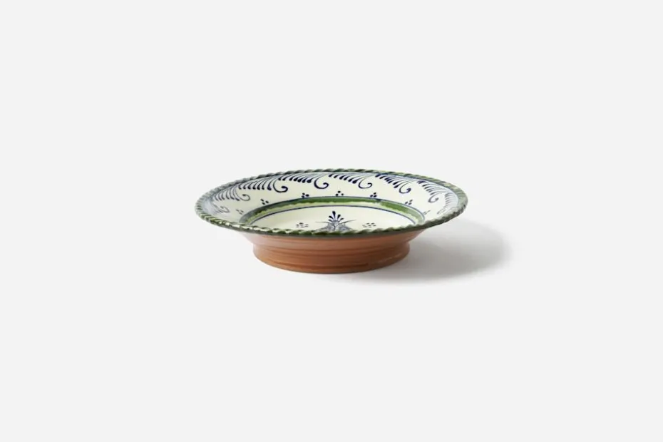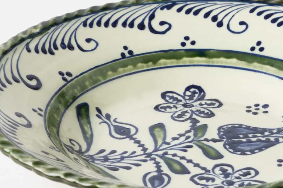 Denna porslinsservis med blå blommor drejas och målas för hand i Rumänien. Den är skapad efter antika, transsylvaniska keramikföremål som bär kulturella influenser från Balkan och Italien i söder, Europa i väster och Osmanska riket och Asien i öster. Keramiken bränns tre gånger i över 1000 grader, vilket gör färgerna skarpa och klara.