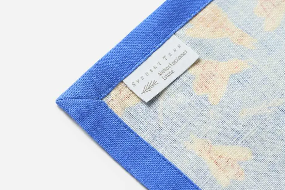 En vacker linneservett med motiv av den grekiske konstnären Alekos Fassianos. Här syns två av hans återkommande motiv såsom biet och vetestrået – båda karaktäristiska för hans distinkta formspråk och symboler för rörelse och frihet.