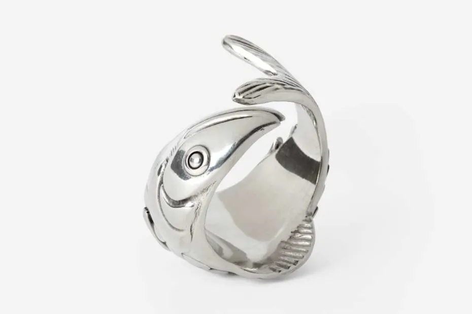 Servettringar i tenn, designade av den danska smyckesformgivaren Charlotte Lynggaard för Svenskt Tenn. Fiskarna är tolkningarna av de arter som lever i havet utanför hennes hus i Öresund, en plats mellan Sverige och Danmark. I dukningskollektionen The North Sea har hon kombinerat sin passion för dukningar med kärleken till fiskar, som hon menar väcker både drömmar och förundran.