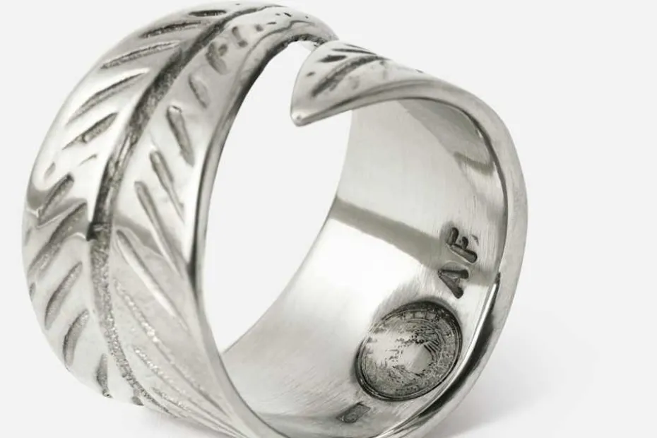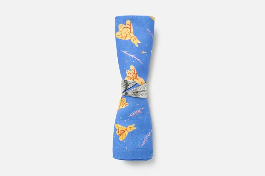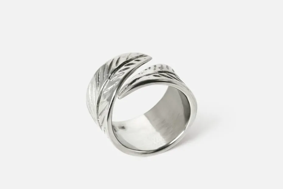 Denna dekorativa servettring i form av ett löv i tenn är skapad efter en detalj på ljusstaken av grekiske konstnären Alekos Fassianos. Ett enastående vackert inslag på det dukade bordet.