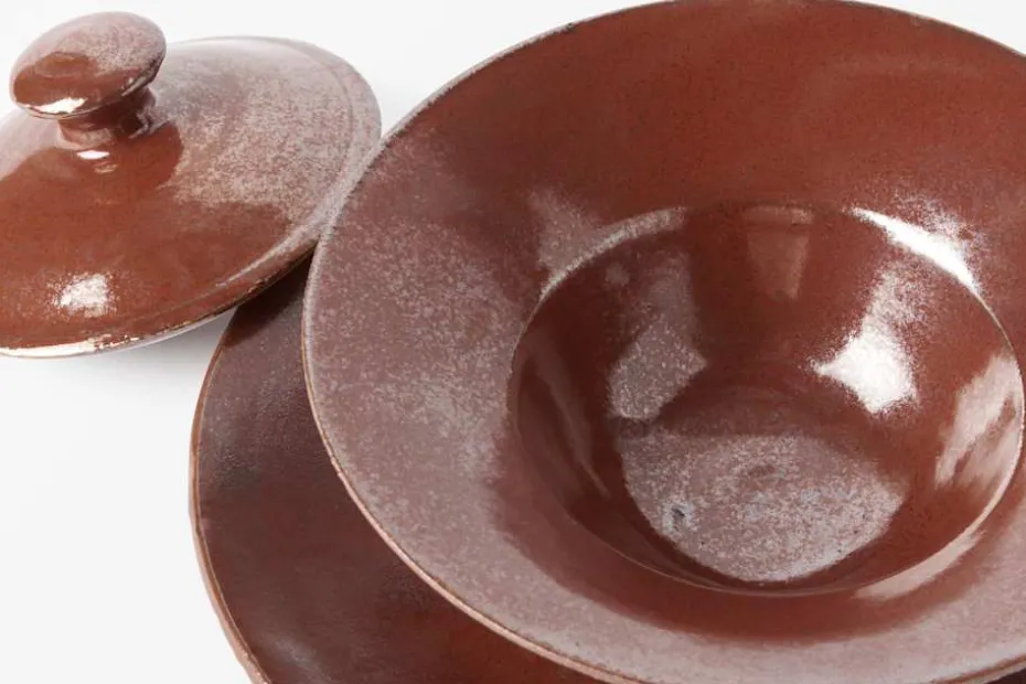 Servisen Ferro är ett vackert set bestående av en assiett och en skål med lock, formgivna och tillverkade för hand av keramikern Calle Forsberg i verkstaden i Saltsjö-Boo. Skålen kan med fördel användas till mindre förrätt, soppa eller dessert tillsammans med den tillhörande assietten på det dukade bordet.