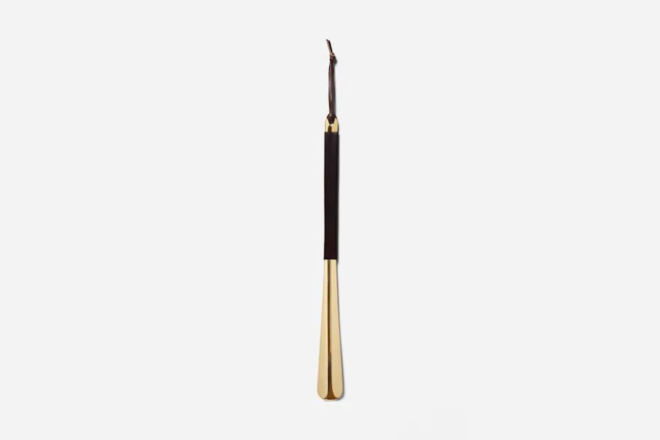 Ett skohorn i läder och mässing, formgivet av Daniel Enoksson för Svenskt Tenn. Mötet mellan det mjuka, varma lädret och den blanka mässingen som ärgas med tiden, ger skohornet en lång livslängd. Ett vackert och funktionellt föremål, skapad med tidlösa och traditionella material.