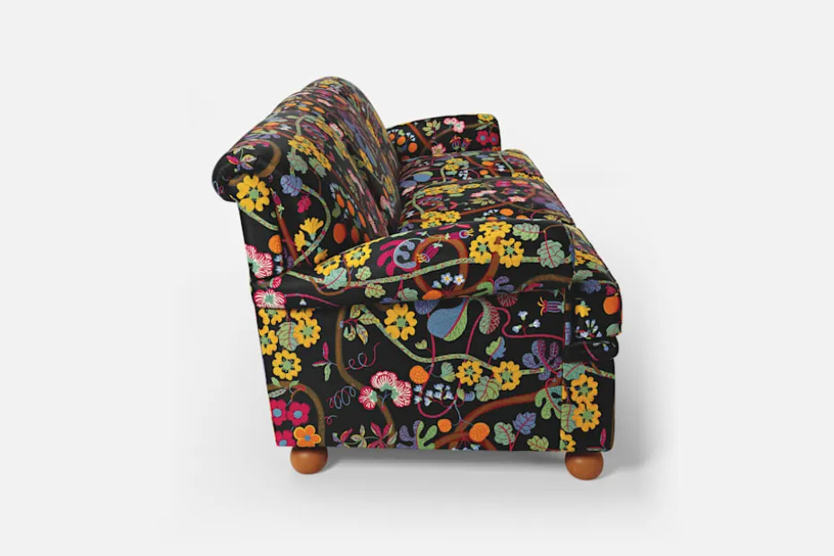 Josef Frank formgav den här långa, rymliga soffan under 1930-talets andra hälft. Ryggpartiet delas av rep vilket utgör en spännande dekor. Enligt Josef Frank skulle också det moderna hemmet vara en plats för vila och bekvämlighet, sittplymåer och dubbla fjädersystem ger en utmärkt komfort.