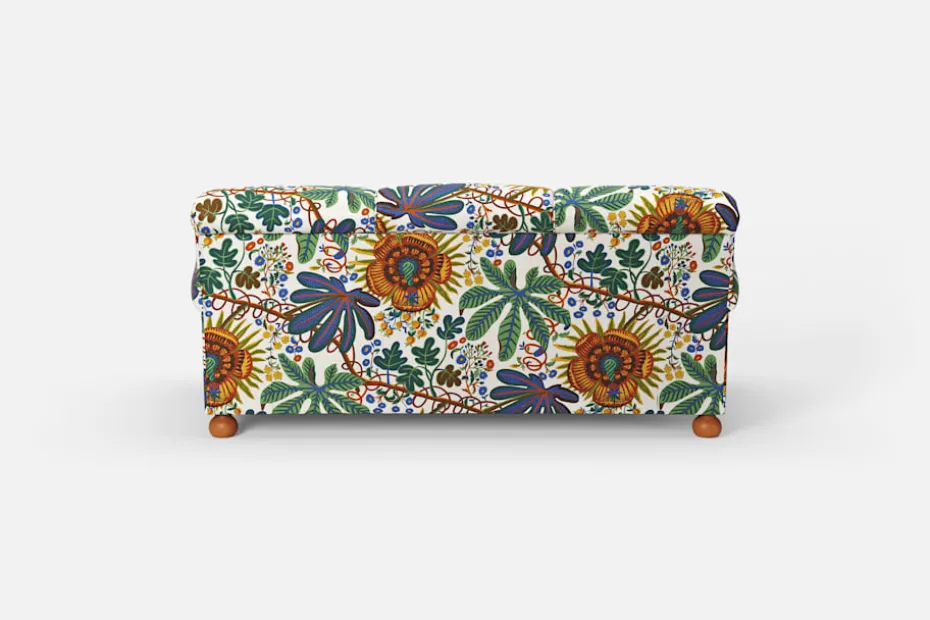 Josef Frank formgav den här långa, rymliga soffan under 1930-talets andra hälft. Ryggpartiet delas av rep vilket utgör en spännande dekor. Enligt Josef Frank skulle också det moderna hemmet vara en plats för vila och bekvämlighet, sittplymåer och dubbla fjädersystem ger en utmärkt komfort.