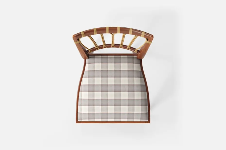 Stol 1165 har en genombruten rygg bestående av lindad rotting. För att skapa en spänning i formen valde Josef Frank ofta att blanda olika träslag och material. Stol 1165 formgavs av Josef Frank 1947.