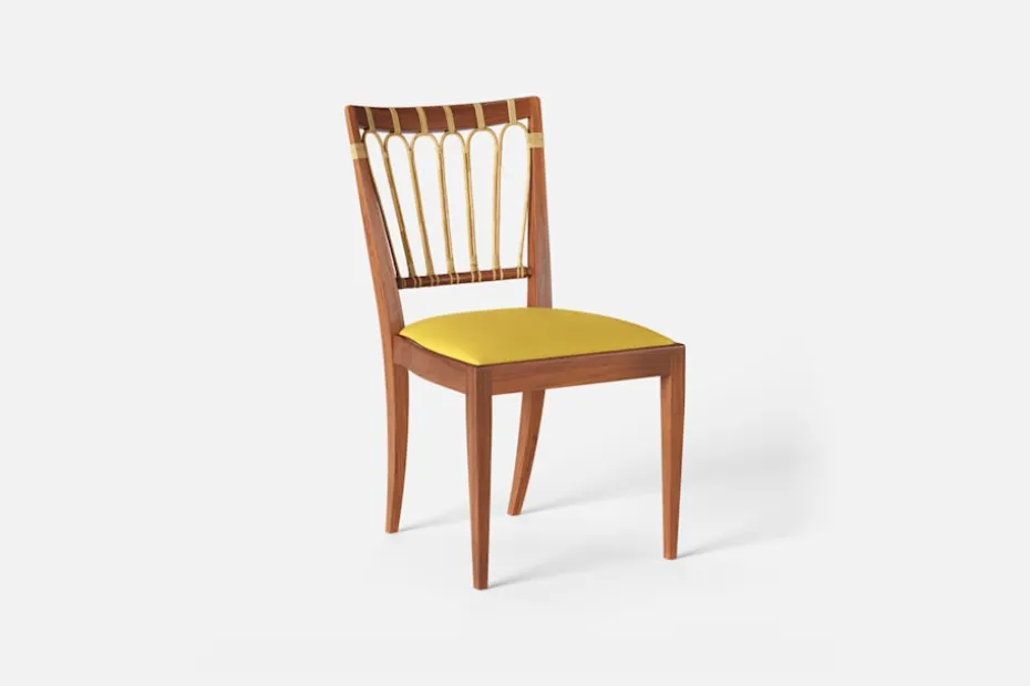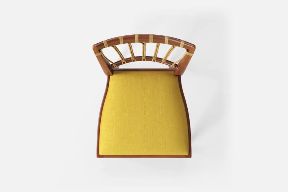 Stol 1165 har en genombruten rygg bestående av lindad rotting. För att skapa en spänning i formen valde Josef Frank ofta att blanda olika träslag och material. Stol 1165 formgavs av Josef Frank 1947.