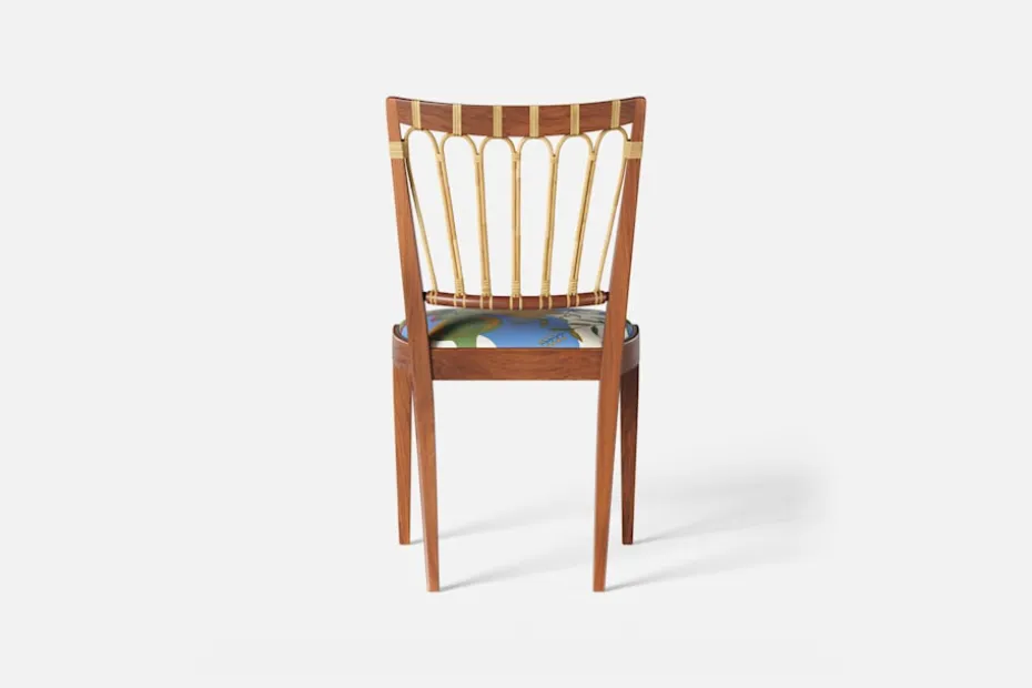 Stol 1165 har en genombruten rygg bestående av lindad rotting. För att skapa en spänning i formen valde Josef Frank ofta att blanda olika träslag och material. Stol 1165 formgavs av Josef Frank 1947.