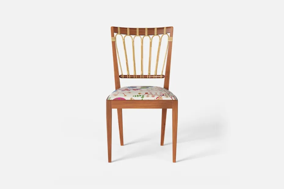 Stol 1165 har en genombruten rygg bestående av lindad rotting. För att skapa en spänning i formen valde Josef Frank ofta att blanda olika träslag och material. Stol 1165 formgavs av Josef Frank 1947.