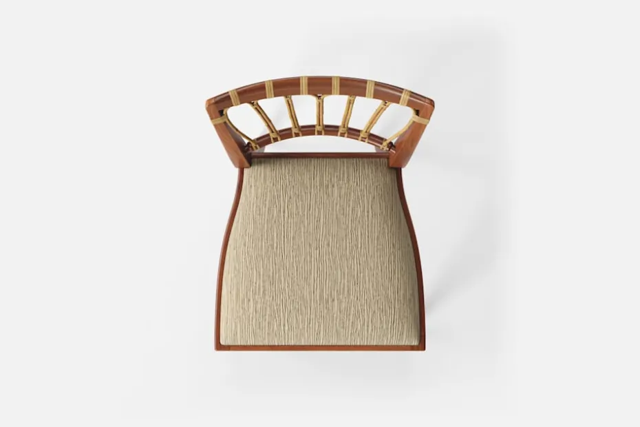 Stol 1165 har en genombruten rygg bestående av lindad rotting. För att skapa en spänning i formen valde Josef Frank ofta att blanda olika träslag och material. Stol 1165 formgavs av Josef Frank 1947.