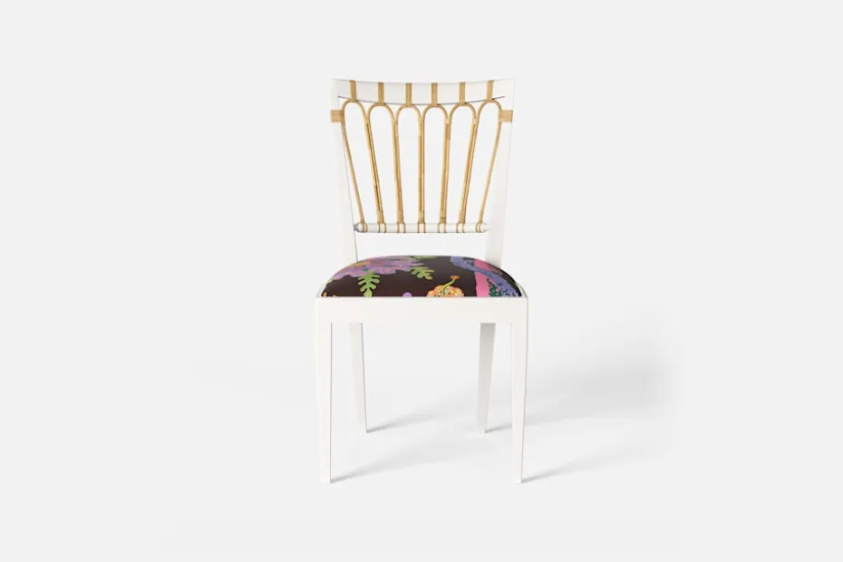 Stol 1165 har en genombruten rygg bestående av lindad rotting. För att skapa en spänning i formen valde Josef Frank ofta att blanda olika träslag och material. Stol 1165 formgavs av Josef Frank 1947.