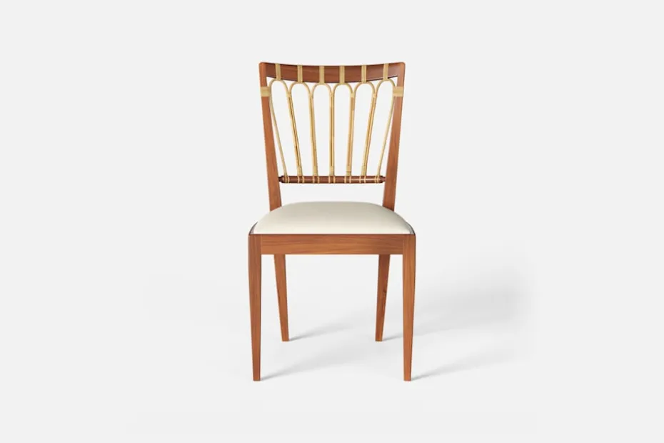 Stol 1165 har en genombruten rygg bestående av lindad rotting. För att skapa en spänning i formen valde Josef Frank ofta att blanda olika träslag och material. Stol 1165 formgavs av Josef Frank 1947.