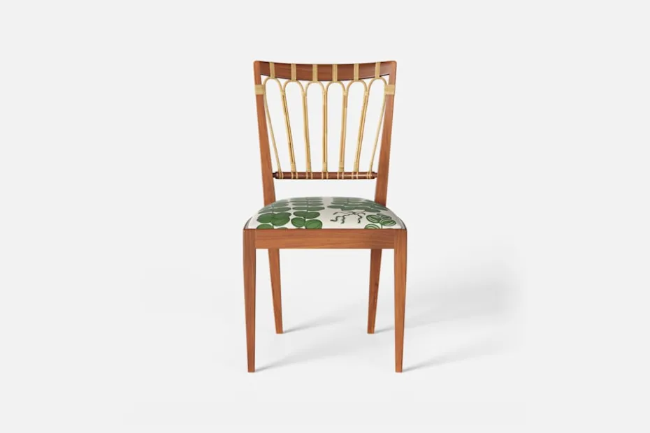 Stol 1165 har en genombruten rygg bestående av lindad rotting. För att skapa en spänning i formen valde Josef Frank ofta att blanda olika träslag och material. Stol 1165 formgavs av Josef Frank 1947.