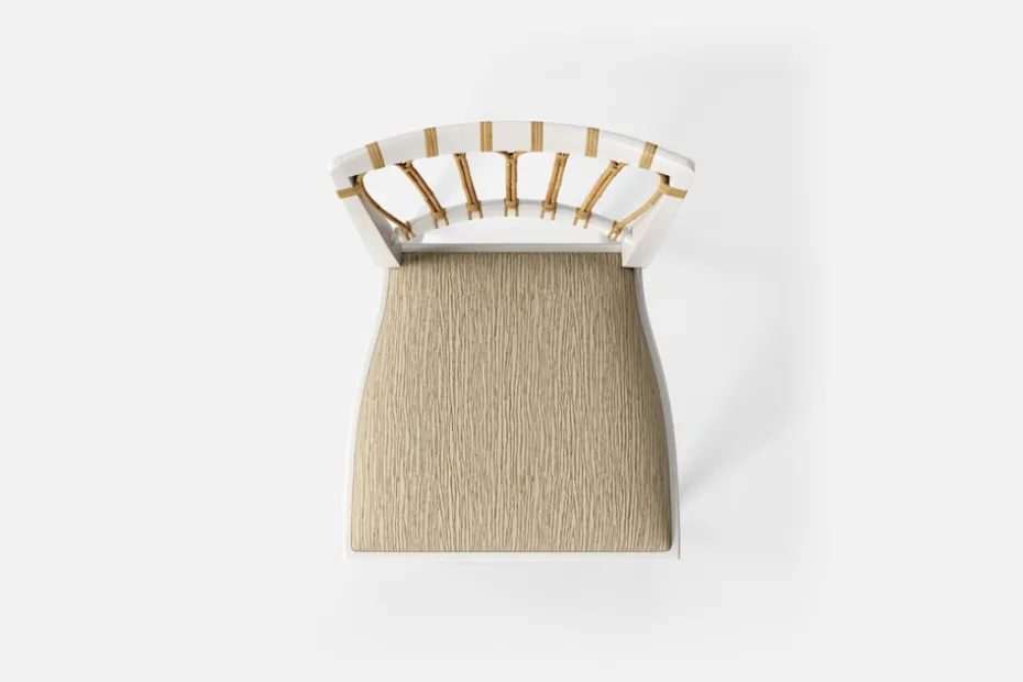 Stol 1165 har en genombruten rygg bestående av lindad rotting. För att skapa en spänning i formen valde Josef Frank ofta att blanda olika träslag och material. Stol 1165 formgavs av Josef Frank 1947.