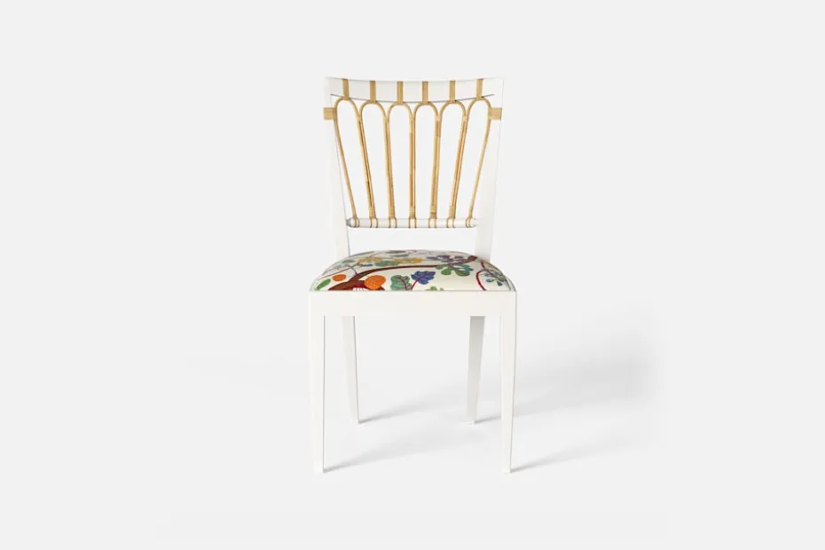 Stol 1165 har en genombruten rygg bestående av lindad rotting. För att skapa en spänning i formen valde Josef Frank ofta att blanda olika träslag och material. Stol 1165 formgavs av Josef Frank 1947.
