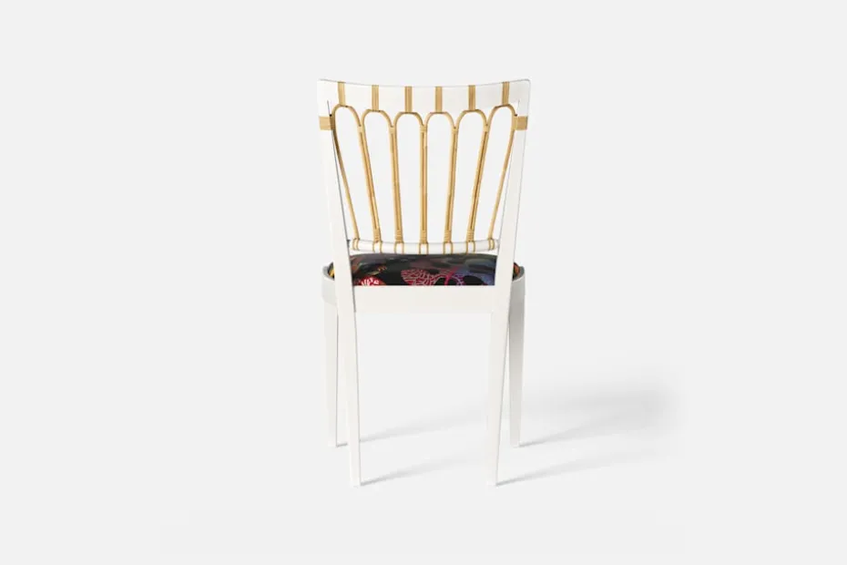 Stol 1165 har en genombruten rygg bestående av lindad rotting. För att skapa en spänning i formen valde Josef Frank ofta att blanda olika träslag och material. Stol 1165 formgavs av Josef Frank 1947.