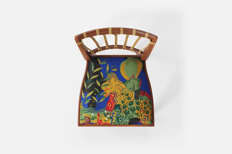 Stol 1165 har en genombruten rygg bestående av lindad rotting. För att skapa en spänning i formen valde Josef Frank ofta att blanda olika träslag och material. Stol 1165 formgavs av Josef Frank 1947.