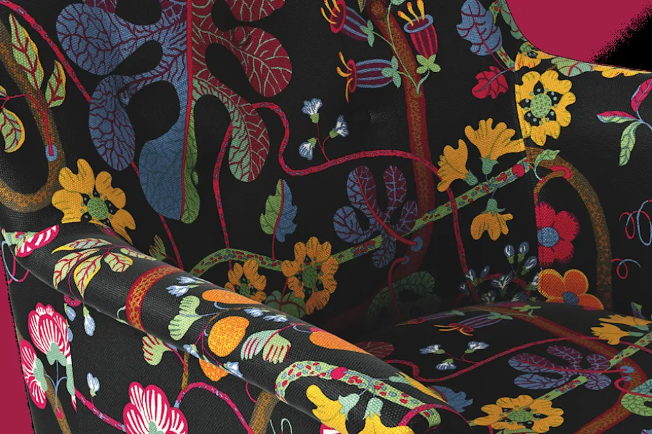Eventuella fläckar på möbelns klädsel kan avlägsnas med en vit, ren trasa fuktad med vatten. Gnid inte på fläcken, utan badda försiktigt upp vätskan. Vid behov kan ett milt fläckborttagningsmedel användas, men prova alltid först på en mindre synlig del av materialet. Använd aldrig starka lösningsmedel och följ alltid skötselråden för möbelns specifika klädsel. Tänk på att direkt solljus och värme påverkar ytans färg och hållbarhet över tid.