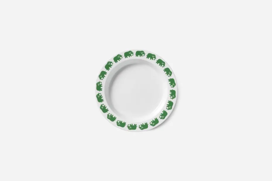 Barnservisen med muggar, skål och tallrik togs fram av Ingegerd Råman i samarbete med Svenskt Tenn. Dekoren har tolkats efter Estrid Ericsons mönster Elefant, som hon efter en förlaga från Belgiska Kongo lät trycka för första gången i slutet av 1930-talet. Om man tittar noga syns det att en av de små elefanterna går åt fel håll.