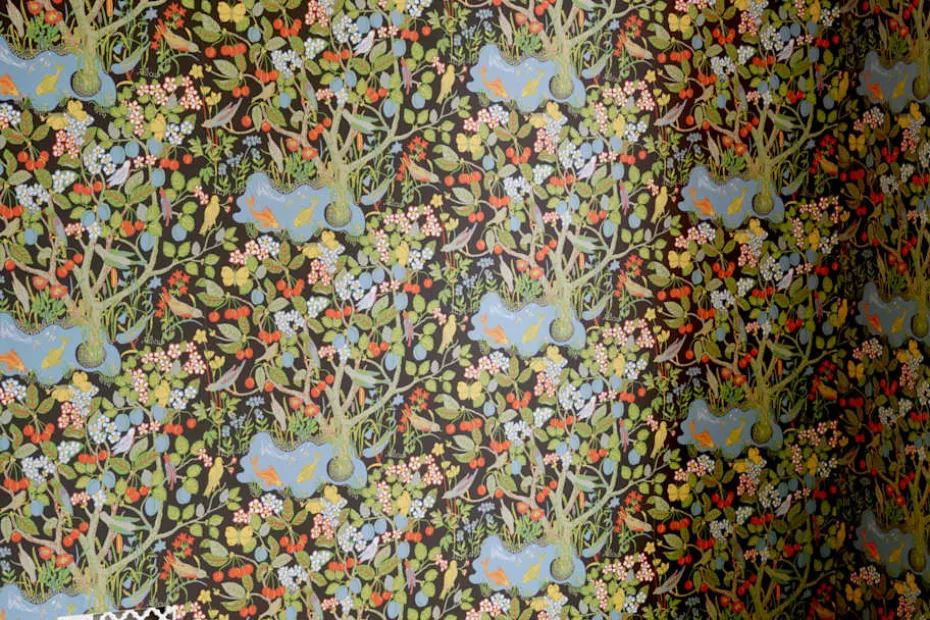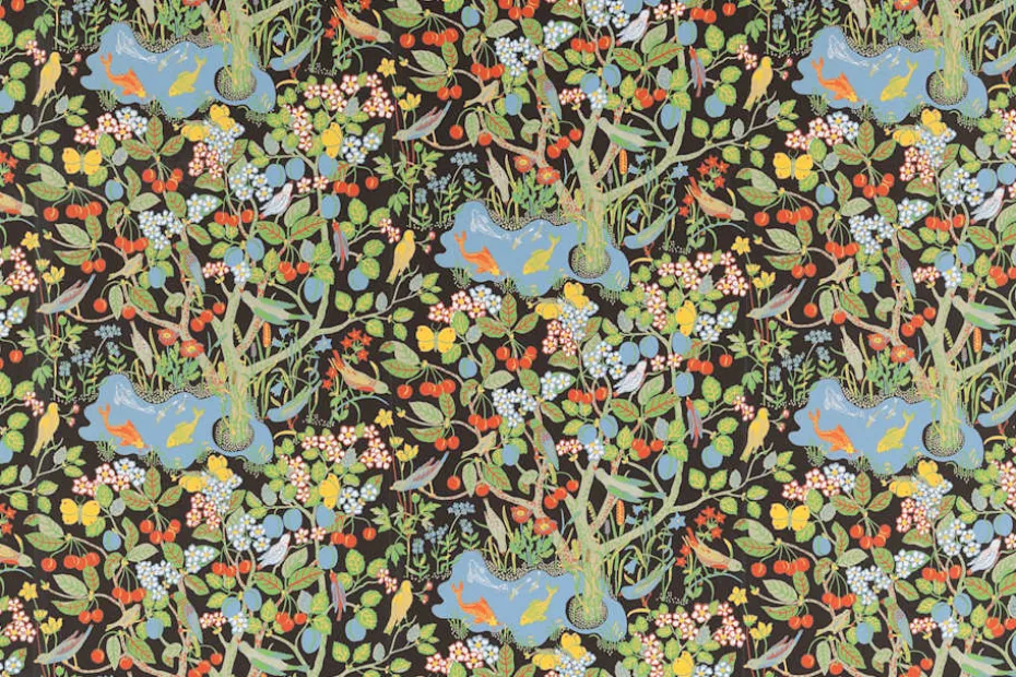I tapeten Paradiset ser vi en konstellation av blommor, frukter, fjärilar, fåglar och fiskar. Ett paradisträd som blommar och bär frukt på samma gång. Man kunde lätt tro att ett mönster som Paradiset helt är en produkt av Franks formfantasi. Men nästan alltid går det att spåra en källa av något slag- från naturen eller konsthistorien.