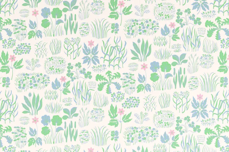 Efter att ha utrustat sig med fälthandböcker om örter, blommor, flora och fauna skapade Josef Frank makalösa mönsterkompositioner. Ett av dessa är mönstret Söndagsmorgon på denna tapet, där han tecknar en sagolik sammansättning av blad, blommor och grässorter där mönstret förstärks av rosafärgade vitsippor.