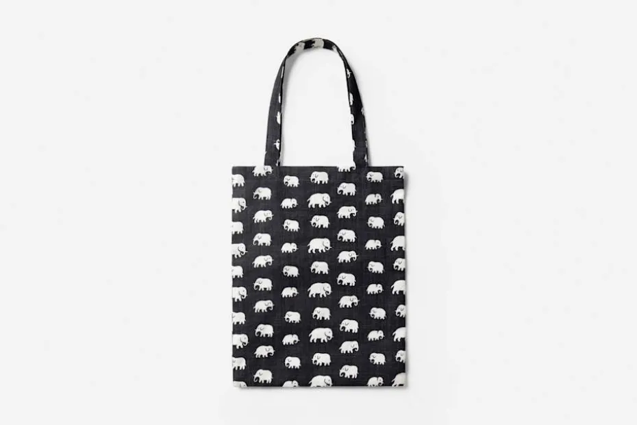 En mjuk tygkasse med Svenskt Tenns klassiska elefantmönster, formgivet av Estrid Ericson på 1930-talet.