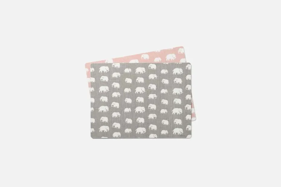 Träskiva laminerad med UV-lack. Underläggen är dubbelsidiga med Estrid Ericsons klassiska Elefantmönster på båda sidor, i olika färger. Det gör att du enkelt kan variera din dukning. Underläggen säljs i 2-pack.