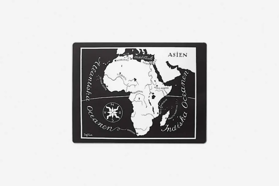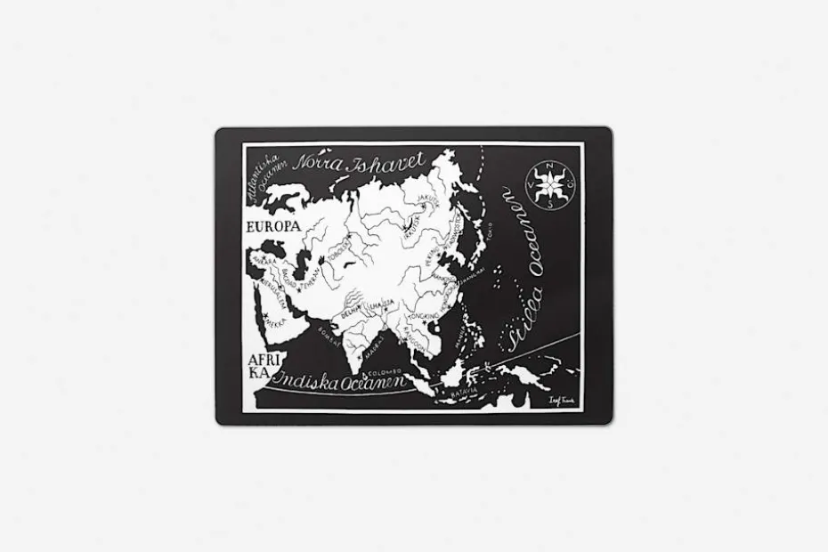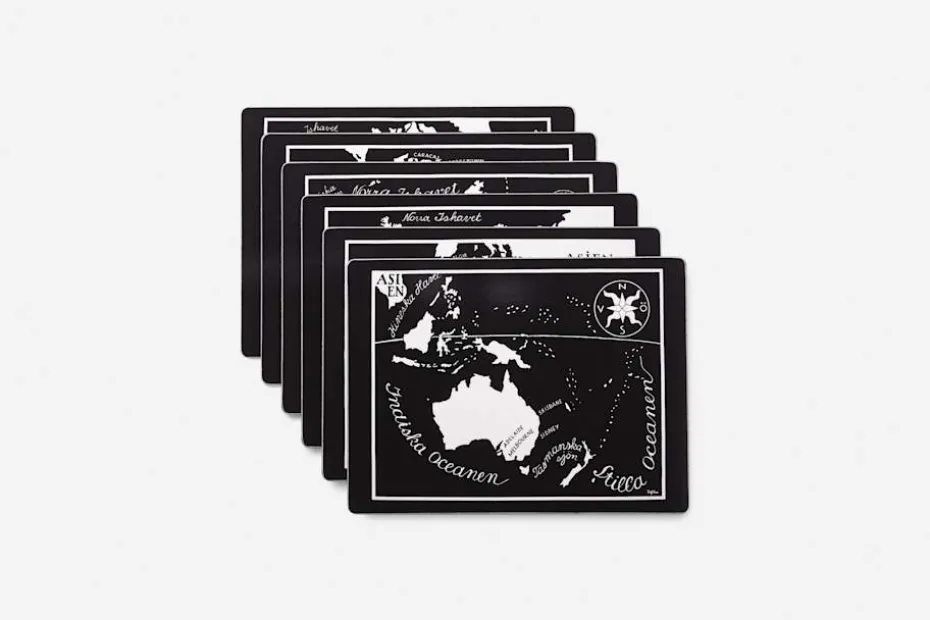 Underläggen med Josef Franks mönster Världskartan från 1939 föreställer en värld i fred, och kontinenter utan gränser mellan länderna. De sex olika underläggen bär motiv föreställandes Afrika, Amerika, Asien, Australien, Europa och Sydamerika.