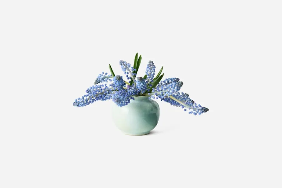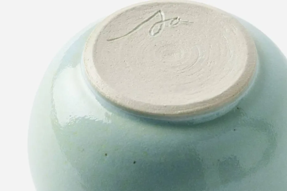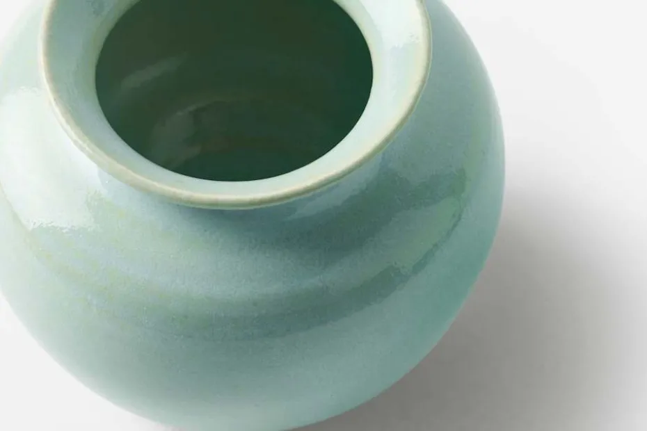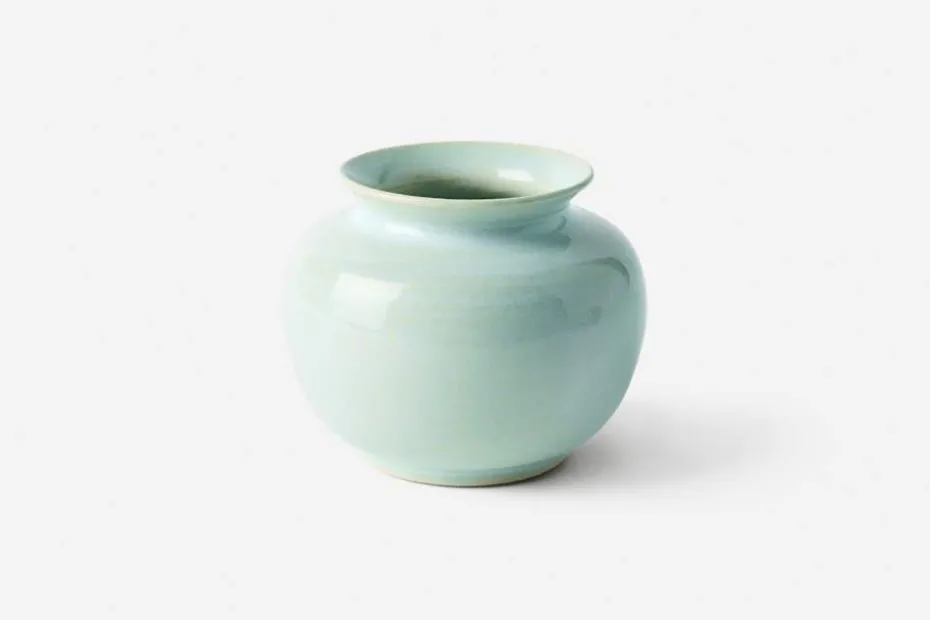 Liten, handgjord keramikvas av Annali Andersson, inspirerad av klassiska, östasiatiska förvaringskrus och vaser. Den ljusblå färgen är en himmelsblå glasyr med inspiration från östasiatisk Chunglasyr från Songdynastin.