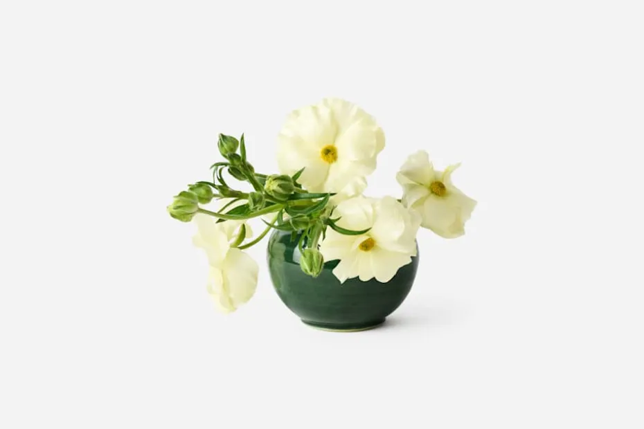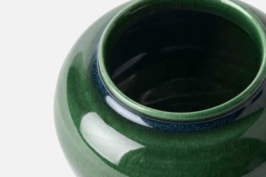 Liten, handgjord keramikvas av Annali Andersson, inspirerad av klassiska, östasiatiska förvaringskrus och vaser. Den oribegröna färgen är en östasiatisk glasyr i naturgrönt som använts för att återspegla berg och floder.
