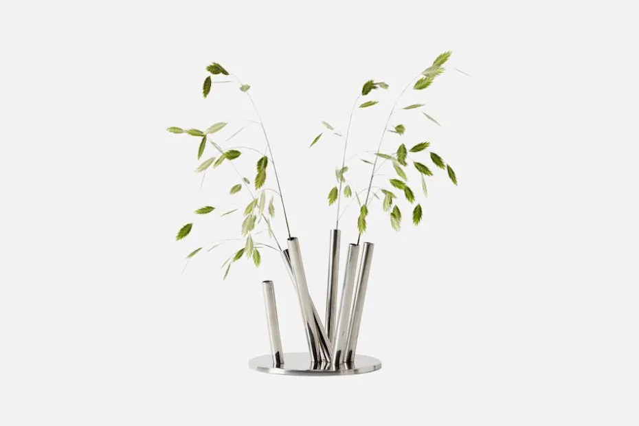 Med sina utstickande pipor sätter sig blommorna vackert i förhållande till varandra, vilket säkert var den tidiga funktionalistformgivaren Nils Fougstedts tanke när han formgav vasen i tenn. Uttrycket känns modernt trots att den formgavs redan 1931.