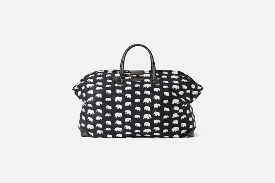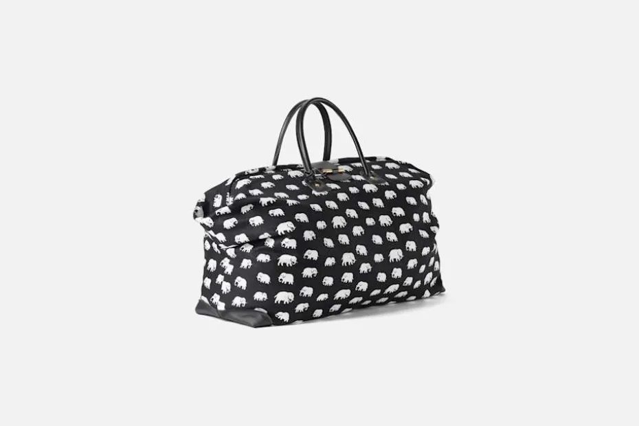 Svenskt Tenns klassiska weekendväska är dekorerad med en dragkedja och knäppning i mässing samt läderdetaljer. Invändigt finns en avtagbar nyckelring samt en ficka. Estrid Ericson har gjort mönsterdesignen och Svenskt Tenn har tagit fram formen. Svenskt Tenns grundare Estrid Ericson reste mycket till olika platser runt om i världen. Hon letade alltid efter vackra föremål, textilier och souvenirer att ta hem och sälja i butiken på Strandvägen. Det var efter en förlaga från Belgiska Kongo som hon formgav mönstret med de små elefanterna. Svenskt Tenn tryckte textil Elefant för första gången i slutet av 1930-talet.