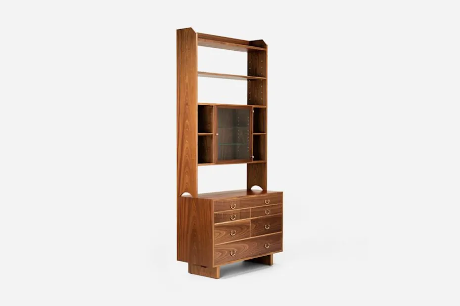 Bokhyllan är uppbyggd i två sektioner och går att kombinera på fyra olika sätt. Välj mellan två överdelar; en med enbart hyllor och en med hyllor och vitrin. Överdelarna kan användas tillsammans med två olika underdelar; en med låda och skåp och en byrå med sex lådor. Mahogny, glas och mässingsbeslag. Varje hylla är unik och träytan kan variera från utförandet på bilden. Samtliga Svenskt Tenns nyproducerade möbler är försedda med en plakett som visar att möbeln är äkta.