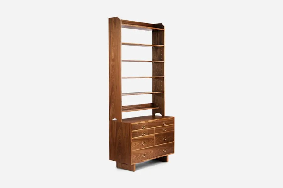 Den klassiska bokhyllan 2112 i mahogny formgavs av Josef Frank för Svenskt Tenn 1950.