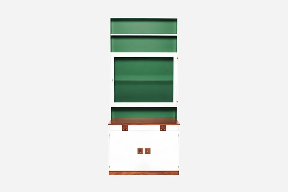Att blanda olika material var typiskt för Josef Franks formgivning. I bokhylla 2255 möter stommens vitlackering och ryggens gröna färg, skivan och beslagsskyltarna i valnöt. Bokhylla 2255 formgavs av Josef Frank år 1943.