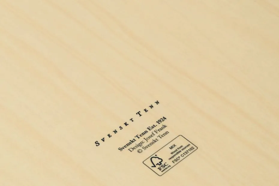 Svenskt Tenns klassiska brickor i björkfaner finns i flera färgstarka mönster av Josef Frank, bland annat Svenskt Tenn Est. 1924. Mönstret Svenskt Tenn Est. 1924 gick ursprungligen under namnet “Stockholm” när det formgavs av Josef Frank omkring 1949 – 1950. Motivet visar en Stockholmskarta, med utvalda platser som Folkungagatan, Karlavägen, Drottninggatan och Mynttorget. Till Svenskt Tenns hundraårsjubileum 2024 har texten Svenskt Tenn Est. 1924 adderats i textremsorna som flätar samman motivet: en hyllning till de 100 år under vilka företaget funnits och verkat i centrum av den svenska och internationella designscenen.
