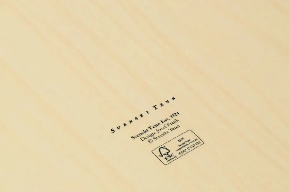 Svenskt Tenns klassiska brickor i björkfaner finns i flera färgstarka mönster av Josef Frank, bland annat Svenskt Tenn Est. 1924. Mönstret Svenskt Tenn Est. 1924 gick ursprungligen under namnet “Stockholm” när det formgavs av Josef Frank omkring 1949 – 1950. Motivet visar en Stockholmskarta, med utvalda platser som Folkungagatan, Karlavägen, Drottninggatan och Mynttorget. Till Svenskt Tenns hundraårsjubileum 2024 har texten Svenskt Tenn Est. 1924 adderats i textremsorna som flätar samman motivet: en hyllning till de 100 år under vilka företaget funnits och verkat i centrum av den svenska och internationella designscenen.