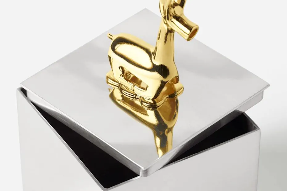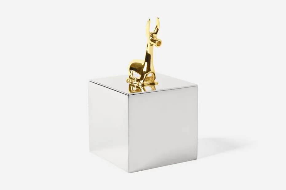Att pryda ett föremål genom att addera ett annat var något som Estrid Ericson återkommande gjorde i sin formgivning. På denna kubformade burk har en antilop i förgyllt tenn fått kröna locket. Hon skapade den med inspiration från Östasiatiska museets samlingar, som Estrid Ericson ofta besökte. Förlagan var en kinesisk figurin i brons från Ordotiden 481 – 221 f.kr.