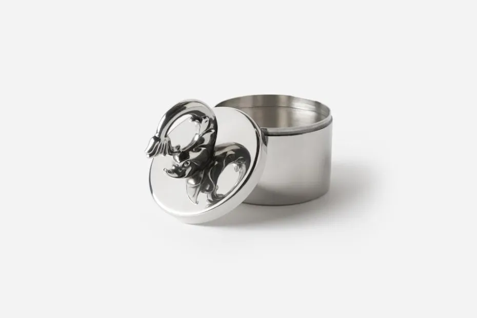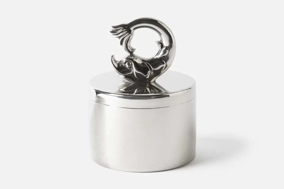 Estrid Ericson reste mycket och samlade under sina resor på sig olika slags saker och mönster. Att pryda ett föremål genom att addera ett annat objekt, var något som Estrid Ericson ofta gjorde. De små burkarna i tenn med figurer på locket är Svenskt Tenns egen design. Burkarna finns i tre olika storlekar och pryds med en delfin, en sjöstjärna eller en snäcka.
