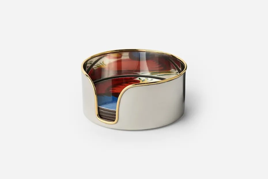Tenn och mässing är materialen i Svenskt Tenns förvaringsställ för glasunderlägg, som finns i en rund och en fyrkantig variant. Ställen är inspirerade av en brevkorg som Björn Trägårdh formgav på 1930-talet.
