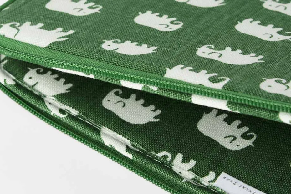 Handsytt, praktiskt och dekorativt datorfodral i Svenskt Tenns klassiska textil Elefant, formgivet av företagets grundare Estrid Ericson. Hon letade alltid efter vackra föremål, textilier och souvenirer att ta hem och sälja i butiken på Strandvägen. Det var efter en förlaga från Belgiska Kongo som hon formgav mönstret med de små elefanterna. Svenskt Tenn tryckte textil Elefant för första gången i slutet av 1930-talet.
