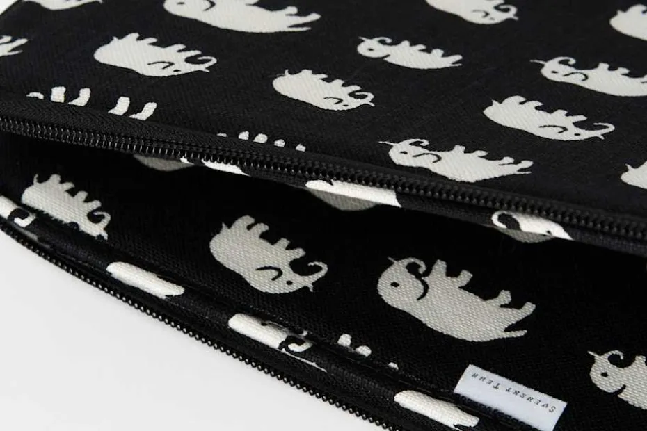 Handsytt, praktiskt och dekorativt datorfodral i Svenskt Tenns klassiska textil Elefant, formgivet av företagets grundare Estrid Ericson. Hon letade alltid efter vackra föremål, textilier och souvenirer att ta hem och sälja i butiken på Strandvägen. Det var efter en förlaga från Belgiska Kongo som hon formgav mönstret med de små elefanterna. Svenskt Tenn tryckte textil Elefant för första gången i slutet av 1930-talet. Elefantmönster