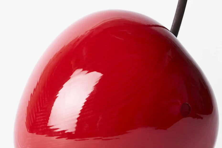 Ett stort, skulpturalt körsbär i trä formgivet av konstnären Pernilla Tjärnström. Det dekorativa körsbäret tillverkas för hand i furu, och varje exemplar laseras tunt för att släppa fram träets ådring och karaktär. Skaften tillverkas av återbrukade högafflar.