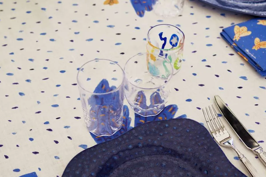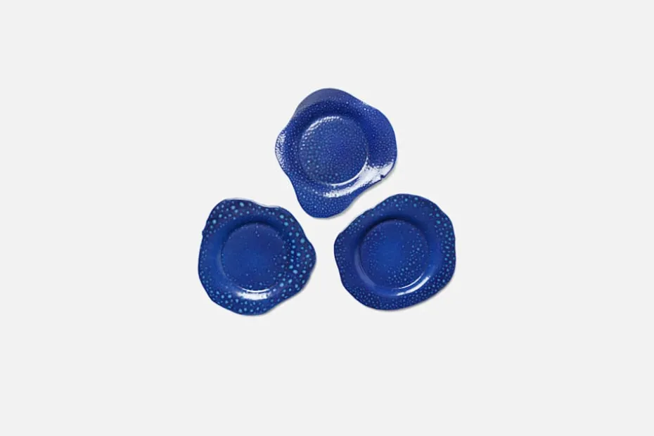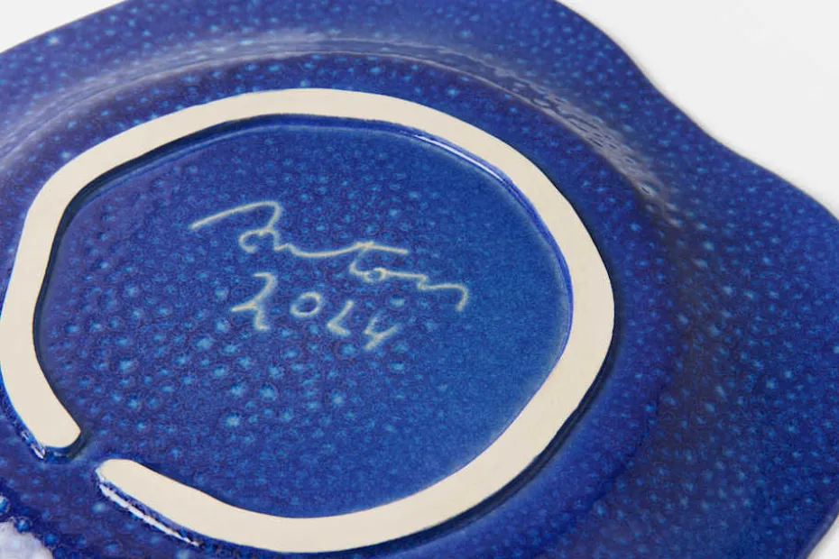 Djupblå fat i glaserat stengods, tillverkade av skulptören och konstnären Anton Alvarez för Svenskt Tenn. Materialet som använts är detsamma som konstnären använder för att skapa sina uppmärksammade, keramiska skulpturer. Faten tillverkas i Antons ateljé i Stockholm. Den hantverksmässiga processen gör att såväl ytan som formen kan variera. Varje fat kan ses som ett konstverk och är unikt i sitt slag.