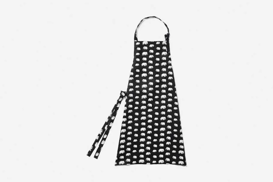 Svenskt Tenns förkläde är lika vackert hängande på en krok i köket som på kocken. Förklädena är tillverkade i linne av högsta kvalitet med mönster av Josef Frank och Estrid Ericson. Svenskt Tenns grundare Estrid Ericson reste mycket till olika platser runt om i världen. Hon letade alltid efter vackra föremål, textilier och souvenirer att ta hem och sälja i butiken på Strandvägen. Det var efter en förlaga från Belgiska Kongo som hon formgav mönstret med de små elefanterna. Svenskt Tenn tryckte textil Elefant för första gången i slutet av 1930-talet.